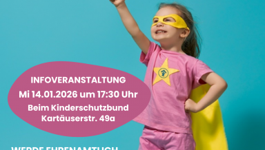Am 06. Februar 2026 beginnen neue Ausbildungen für das Ehrenamt (Begleiteter Umgang, Familienpaten und Kinder- und Jugendtelefon). Anmeldeschluss ist der 07. Dezember 2025 Informationsveranstaltungen zum Ehrenamt finden statt am: